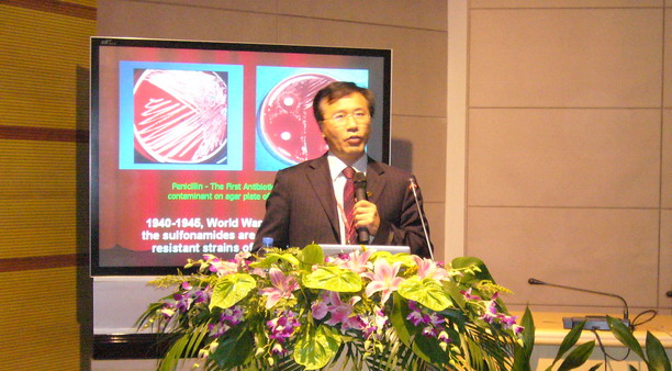 报告前,王锡昌院长向大家介绍了邓子新院士的基本情况。随后,围绕报告主题,邓院士分别从微生物次生代谢产物的活性多样性、微生物代谢(生物合成)途径、次生代谢产物生物合成基因的组成特点、我国在研的主要农业抗生素基因簇及现状、天然产物研发应紧扣的几个环节与潜在的生物学及生物工程学意义等几个方面进行了详细阐述,并对微生物药物的发展前景进行了展望。邓院士的介绍翔实生动,深入浅出,给与会听众留下了深刻印象。对现场听众的提问,邓院士还一一予以认真解答,加深了与会听众对微生物专业领域的了解,拓宽了专业知识面。