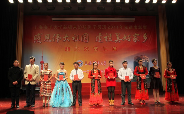 2012年1月4日下午,上海海洋大学新疆喀什地区来沪培训学员班表彰先进暨“感恩伟大祖国,建设美好家乡”主题文艺汇报演出在我校大学生活动中心报告厅隆重举行。我校副校长封金章,浦东新区合作交流办主任徐才、副主任奚晓龙、副处长蒋晓峰应邀出席会议。我校相关部门负责人、各学院部分师生和后勤员工观看了精彩的演出,共同感受民族文化,体验西部风情。