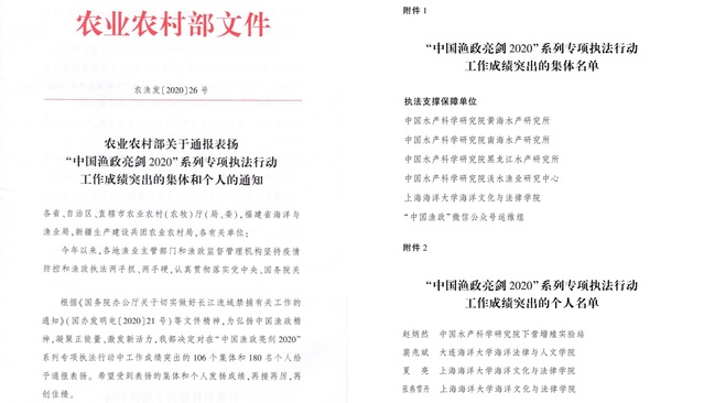 近日,农业农村部印发了《关于通报表扬“中国渔政亮剑2020”系列专项执法行动工作成绩突出的集体和个人的通知》,海洋文化与法律学院获“‘中国渔政亮剑2020’系列专项执法行动工作成绩突出的集体”称号,也是唯一受表扬的高校单位;学院教师夏亮、张燕雪丹获“‘中国渔政亮剑2020’系列专项执法行动工作成绩突出的个人”称号。