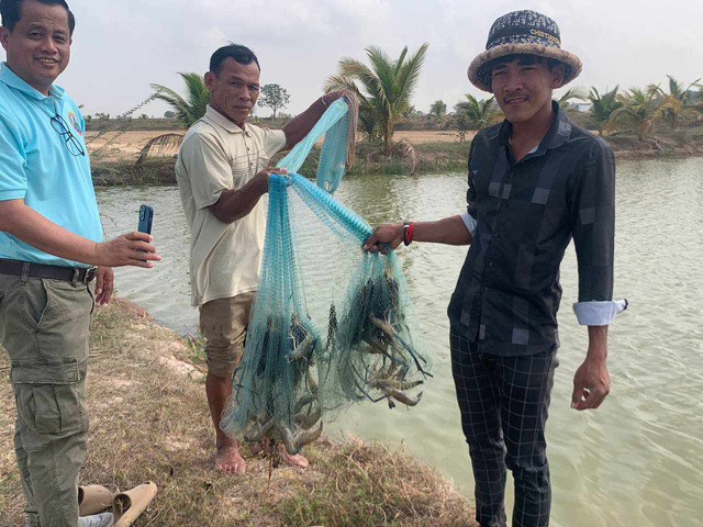 Thay Somony处长通过手机连线向项目组和当地农户介绍了“水稻-罗氏沼虾种养模式”在当地的发展情况,现场查看了罗氏沼虾中间培育池塘、“水稻-罗氏沼虾轮作”稻田和巴沙鱼养殖池塘等,当地示范户现场捕捞和展示了其养殖的大规格罗氏沼虾和巴沙鱼苗。双方约定本年度将继续深化合作,项目组拟通过实地指导、线上交流和研究生联合培养等多种方式进一步推动柬埔寨稻渔种养产业的发展,为当地民众提供更多的优质稻米和水产品,从而保障当地居民的粮食安全与营养水平,为柬埔寨稻渔产业发展和农村人口减贫提供中国方案。