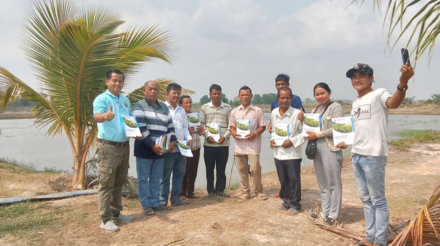 交流活动开始前,Thay Somony处长代表项目组给柬埔寨Takeo省当地稻虾示范户赠送了由项目组编写和制作的柬埔寨语版《稻渔种养技术手册》,该手册涵盖了稻渔种养的基本原理、通用技术、推广策略和典型模式,可以给柬埔寨基层农技人员、农民和青年学生提供技术参考。稻虾养殖户激动地接过这份技术手册,非常感谢柬埔寨农林渔业部、中国农业农村部和上海海洋大学对他们的帮助,他们对当地稻种养产业的发展充满了期望。