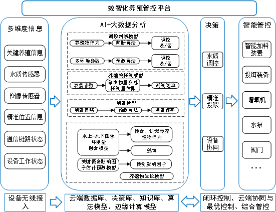 渔业数智化养殖管控平台是系统的核心。其物联网数据采集系统由现场各种传感器、摄像头组成,通过无线通信技术,将多维度信息上传到数智化养殖管控云平台,平台上开发了决策库、知识库、设备规则库,通过深度学习赋能,实现关键环境因子预测预警,鱼类摄食行为评估和健康状态诊判。并能通过获取养殖对象的特征、知识信息融合形成决策,结合各设备控制规则库,进行水质智能调控、精准投饵、设备协同作业和优化调度,管控命令由云平台分发给各个养殖现场设备,相关指标信息和预警发送给用户终端,实现养殖过程的全智能管控。
