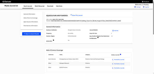 在上海海洋大学即将迎来113岁生日之际,我校创办的我国水产领域首本英文国际学术期刊《渔业学报(英文)》(Aquaculture and Fisheries),正式被Web of Science核心合集ESCI(Emerging Sources Citation Index)数据库收录。据悉,期刊2022年后刊出的文章将全部纳入ESCI,且将于2026年迎来首个影响因子,标志着其国际学术影响力实现跨越式提升。