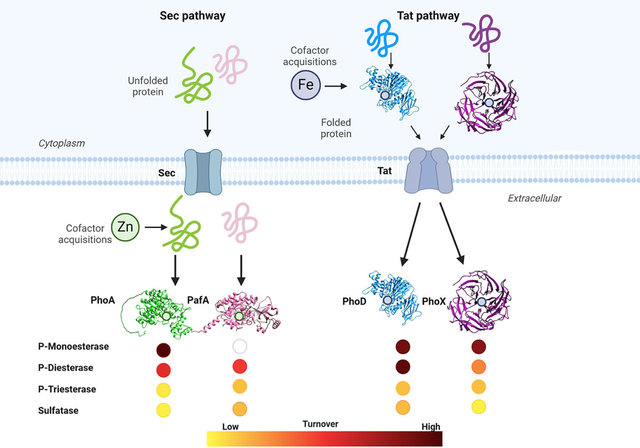 该研究还揭示了这些酶采用的不同策略。例如,PhoD酶受到严格调控,在磷匮乏条件下具有高活性,扮演着专门、高效的“清道夫”角色。相比之下,PhoA酶的生成更为持续,表明它在营养循环中扮演着持续的背景角色。