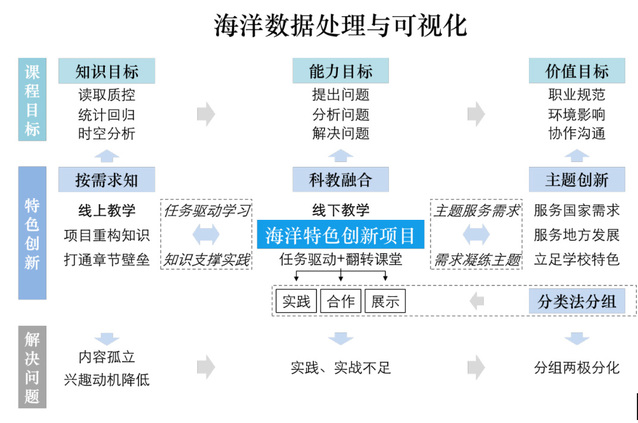 《海洋数据处理与可视化》是学校海洋科学专业的核心课程,自2014年课程开课以来,课程紧密围绕国家海洋强国战略与“智慧海洋”需求,系统讲授海洋数据处理的经典方法与前沿人工智能技术,内容覆盖数据读取、质量控制、预处理、统计分析、回归预测、时空结构分离及可视化全流程,教学内容融入“全球海表二氧化碳分压重构”“东海海洋热浪预测”“黄海浒苔智能监测”和“金枪鱼渔场热点预测”等AI驱动的海洋特色案例,强化学生运用AI解决复杂海洋科学问题的能力,致力于培养具备海洋数据处理、分析与可视化核心能力的高素质海洋科技人才。该课程曾荣获国家级和市级一流本科课程、市级重点建设课程等称号,依托该课程出版纸质及数字教材《海洋数据处理与可视化》,获中国石油大学、河海大学等兄弟院校选用并获一致好评。