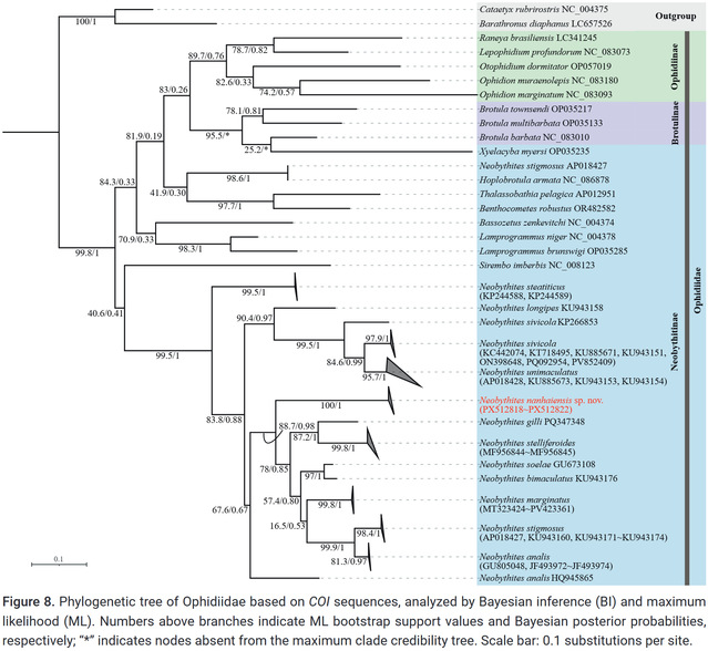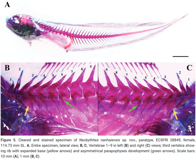 我校2023级博士研究生、中国水产科学研究院东海水产研究所助理研究员陈佳杰,发现一种鼬鳚科鱼类新物种,命名为南海新鼬鳚(Neobythites nanhaiensis)。该研究由我校联合相关单位共同完成,陈佳杰为第一作者,我校钟俊生教授为通讯作者。研究成果“Neobythites nanhaiensis sp. nov. (Ophidiidae, Ophidiiformes) from the South China Sea, with morphology, mitogenome, and its phylogenetic position,”于近期在国际动物分类学期刊《Zookeys》正式发表。