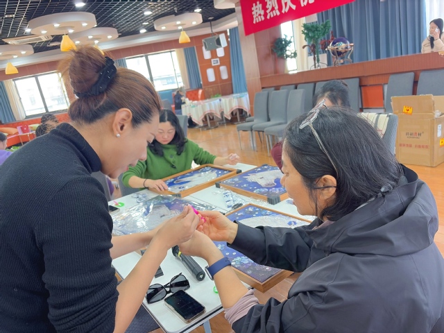 活动现场专业非遗老师为大家生动讲解珍珠画的历史渊源、传统工艺与文化价值,带领大家走近非遗、认识非遗。讲解结束后,进入沉浸式手工创作环节。在老师一对一指导下,大家拿起镊子、胶水,将一颗颗莹润光洁的珍珠,沿着设计图纸细心排列、粘贴、固定。指尖轻捻、匠心勾勒,现场时而专注静谧,时而笑语盈盈,女教工们相互交流心得、切磋技巧,原本零散的珍珠,在巧手下逐渐变成一幅幅精致典雅的珍珠画作品。