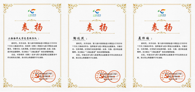 近日,由中共上海市委社会工作部、共青团上海市委员会下发的《关于通报表扬第八届中国国际进口博览会优秀志愿者和志愿服务先进集体的决定》文件中,对我校一个集体“上海海洋大学志愿服务队”和两名学生(陶欣然,水产与生命学院;聂梓楠,海洋科学与生态环境学院)予以通报表扬。