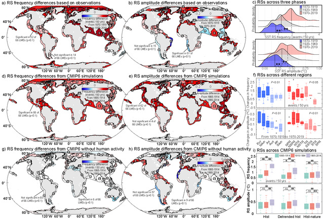 研究团队整合多套海温观测数据集、气候模式模拟数据,以及溶解氧、浮游生物和全球渔业捕捞数据,对全球66个大海洋生态系统展开了全面分析(图 1)。结果显示,过去150年间,全球大海洋生态系统海表面温度跃变的频率和幅度飙升130%至140%(图2)。该趋势呈现明显的空间异质性,西边界流和东边界上升流系统成为热点区域,北半球跃变发生显著强于南半球。通过对比不同气候模式模拟结果,团队发现自然强迫下海洋温度突变事件无显著变化,而人为变暖能抑制冷相温度转变、强化暖相转变,让海洋温度呈“阶梯式”上升,证实了人类活动引发的全球变暖是驱动这一变化的关键因素。未来气候情景模拟显示,在符合《巴黎协定》1.5℃温控目标的低排放情景下,21世纪后半叶海洋温度突变的频率和幅度有望回落至20世纪后期水平,但高排放情景下突变频率将激增130%-180%,幅度上升20%-40%。值得警惕的是,北极海域即便在最严格的减排情景下,其温度突变事件仍会持续加剧,这可能与海冰的持续融合有关。