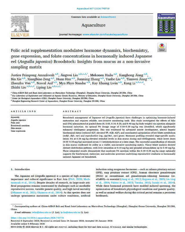 上述研究由上海海洋大学水产与生命学院刘利平教授团队主持完成。发表于《Aquaculture》的论文第一作者为实验室加纳留学生Justice Frimpong Amankwah,通讯作者为刘利平教授和刘经纬老师。相关研究获得国家重点研发计划项目、农业农村部政府购买项目、上海市农委科技攻关和上海市科委项目等资助。经过18年的持续积累,团队已围绕鳗鲡人工繁殖方向培养研究生33名,发表相关论文37篇,申请专利11项,逐步形成了结构较为合理、研究方向稳定的科研梯队和持续创新基础。
