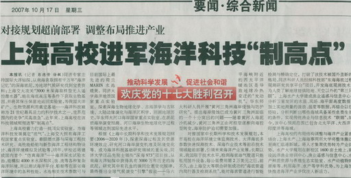 10月17日,解放日报在要闻版“欢庆党的十七大”专题栏目,以“上海高校进军海洋科技'制高点'”为题,对上海高校在海洋科技领域取得的最新成果进行了综合报道。文中对我校利用海洋、水产优势为推进上海海洋产业发展的新举措、新成果进行了介绍。现转摘该文如下,供大家学习参考: