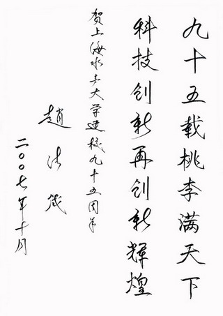 中国水产科学研究院黄海水产研究所名誉所长、中国工程院院士赵法箴为我校校庆题词:“九十五载桃李满天下,科技创新再创新辉煌”,祝贺我校校庆九十五周年。