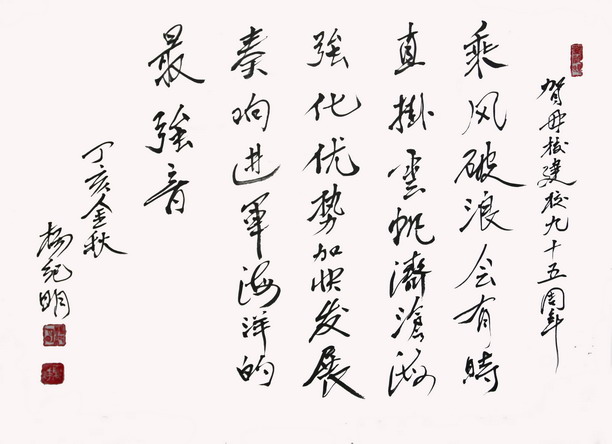 美国纽约科学院院士、我校1953届渔捞科专业杨纪明校友为我校校庆欣然题词:“乘风破浪会有时,直挂云帆济沧海,强化优势,加快发展,奏响进军海洋的最强音”,祝贺母校建校九十五周年。