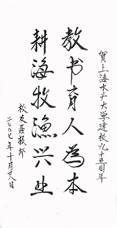 1977届海洋捕捞专业聂振邦校友为我校校庆题词:“教书育人为本,耕海牧渔兴业”,祝贺母校建校九十五周年。
