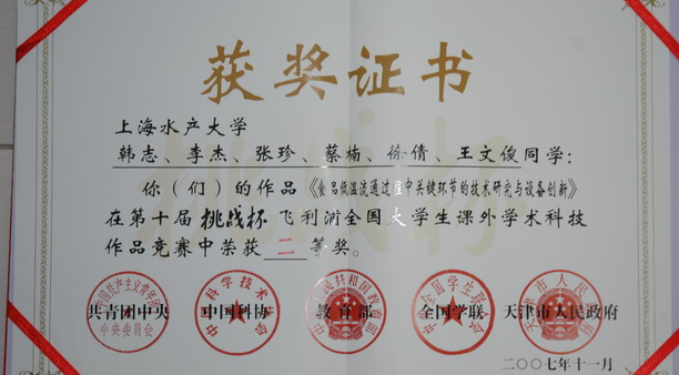 由共青团中央、中国科协、教育部、全国学联和天津市人民政府联合主办,南开大学承办的第十届“挑战杯” 竞赛于昨晚闭幕。我校韩志等同学的参赛作品《食品低温流通过程中关键环节的技术研究与设备创新》获得银奖,该作品由食品学院选送、我校博士生导师谢晶教授指导完成。这是我校第三次获得“挑战杯”课外科技作品全国大奖,也是2003年以来我校第二次获得“挑战杯”银奖。